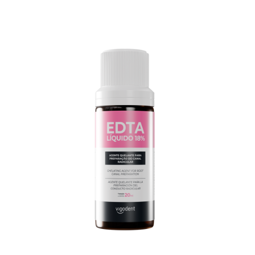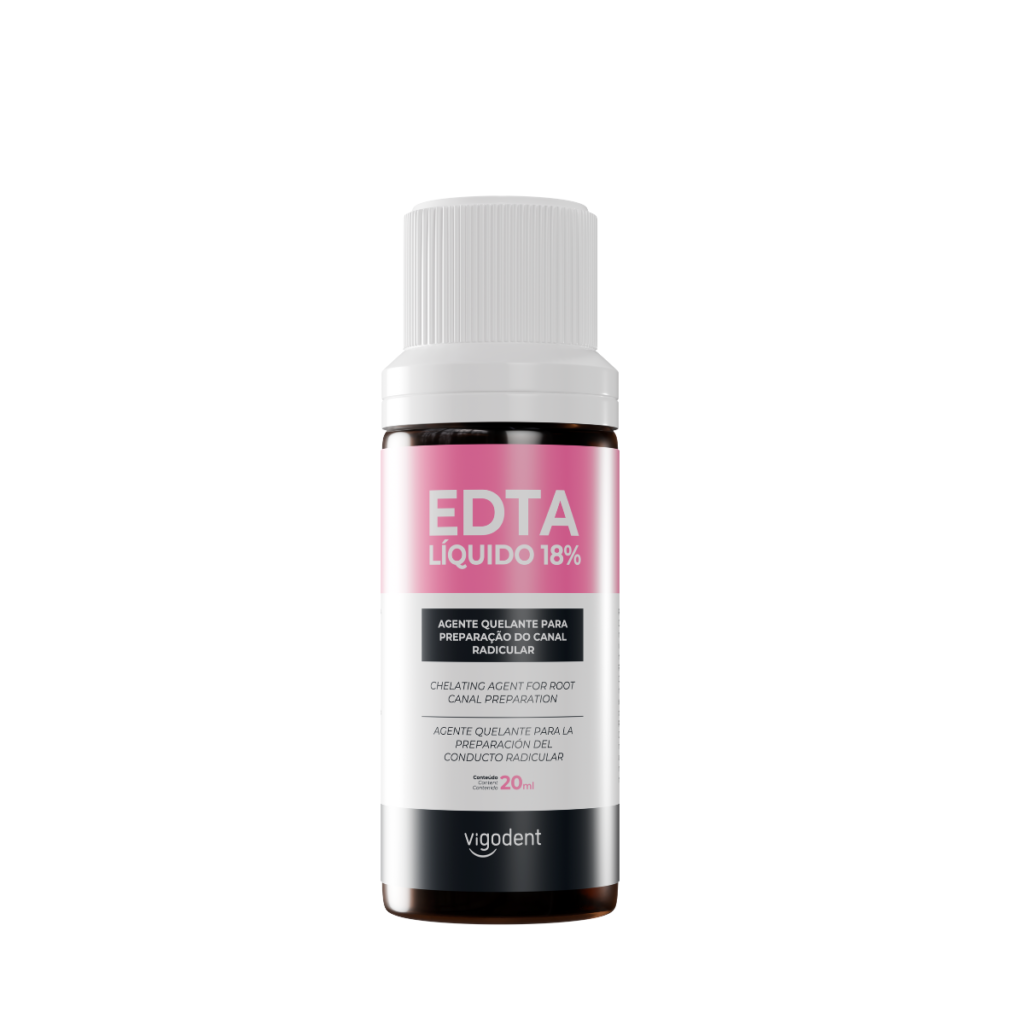 El EDTA líquido al 18% es un agente quelante utilizado dentro de la cavidad pulpar para preparar las paredes de los conductos radiculares. Actúa desmineralizando las partículas de dentina, facilitando su disolución y eliminando eficazmente el barro y los raspados dentinarios, aumentando la permeabilidad de la dentina y facilitando la adherencia del tejido conectivo tratado a la superficie radicular en la terapia periodontal.