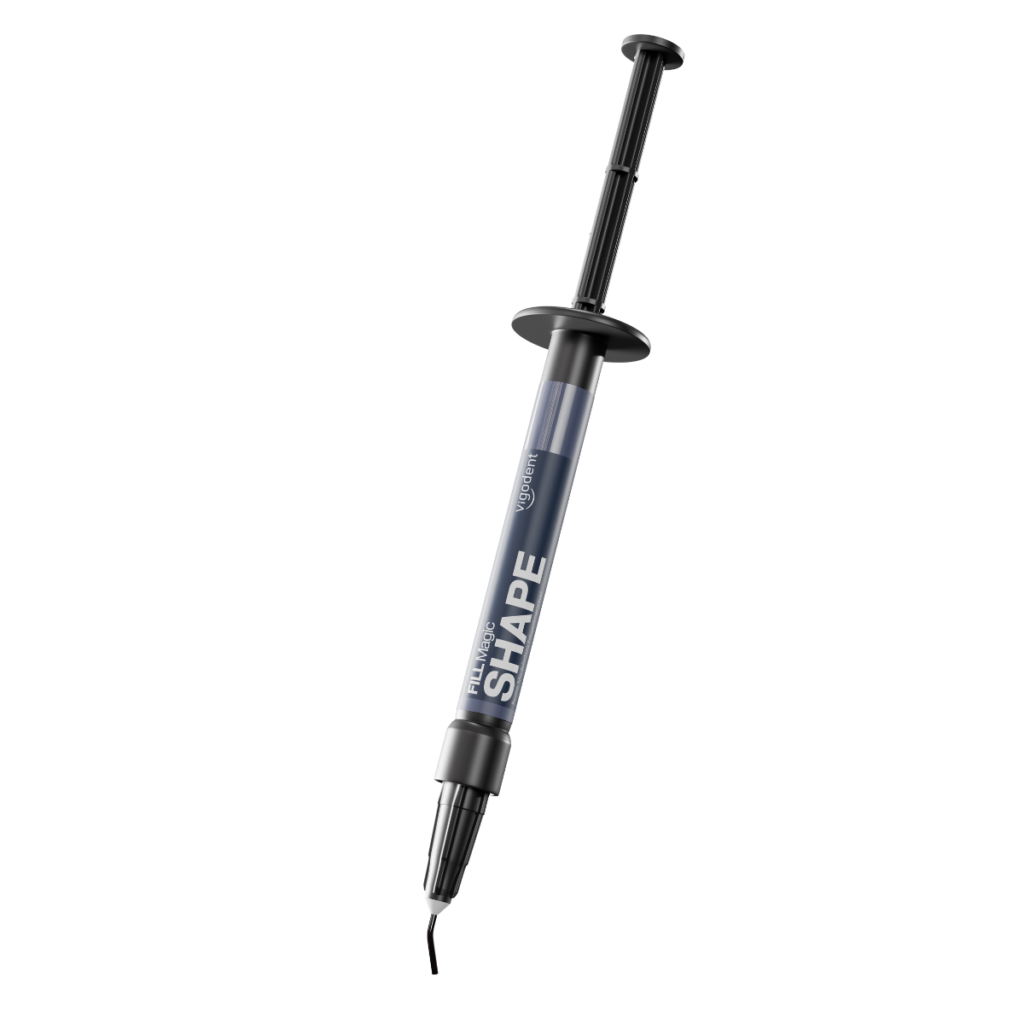 A Fill Magic Shape es una resina modeladora fotopolimerizable de excelente relación calidad-precio que promueve la humectación de instrumentos como pinceles y espátulas durante la etapa de escultura de resina compuesta.